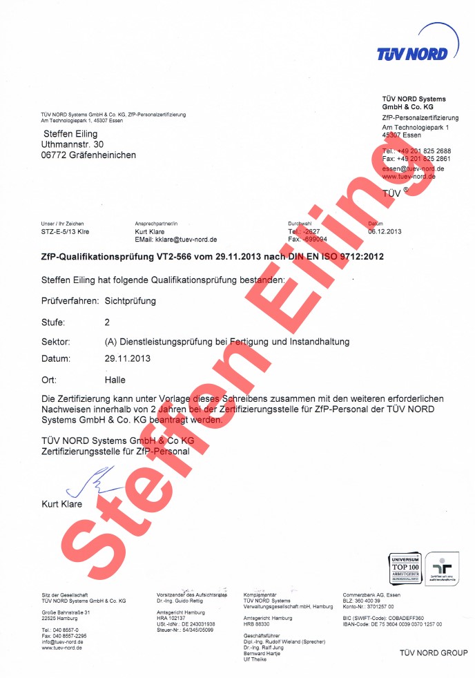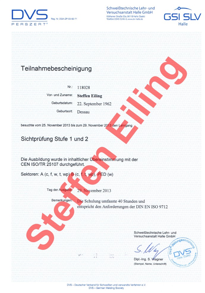 Außerdem verfüge ich eine Qualifizierung zum Sichtprüfer gemäß CEN/ISO 25107.