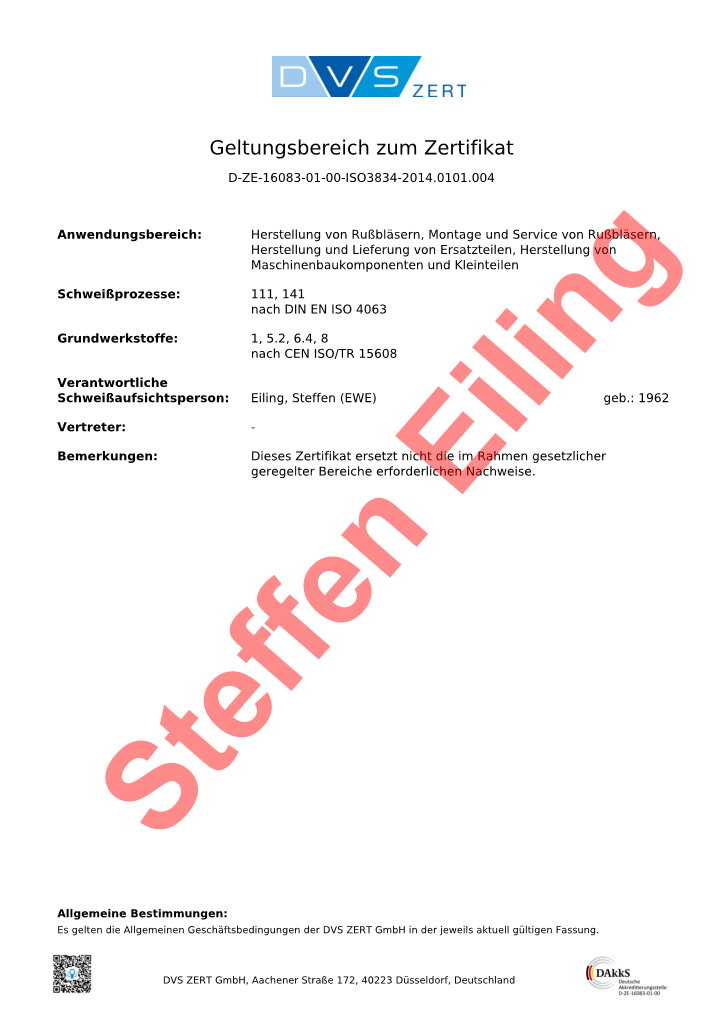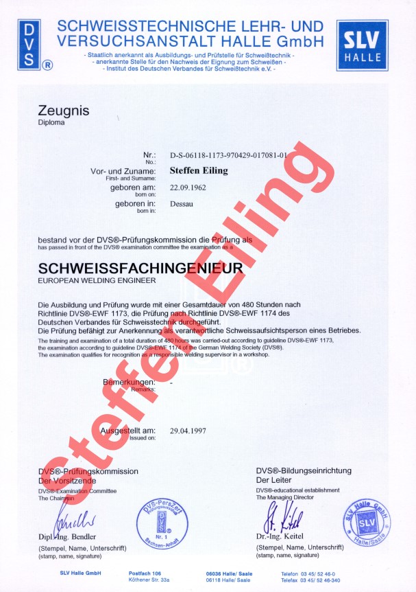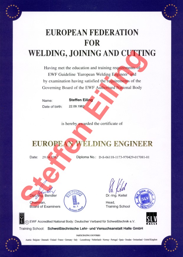 Neben meiner hauptsächlichen Tätigkeit als Fertigungsplaner und Stahlbaukonstrukteur war ich bisher auf Grund meiner Qualifikation als Schweißfachingenieur seit 1998 auch über mehrere Jahre als verantwortliche Schweißaufsichtsperson (Großer Eignungsnachweis bzw. Herstellerbescheinigung Klasse E nach DIN 18800, Teil 7) tätig.